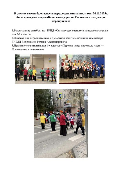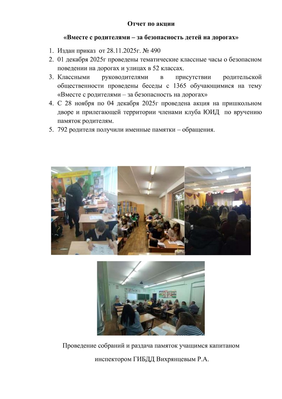 Во исполнение приказа департамента по образованию администрации Волгограда от 16.11. 2016 г. № 839 в период с 28 ноября по 2 декабря 2016 г. проводится городская акция «Вместе с родителями – за безопасность детей на дорогах». В МОУ СШ №54 28-29 ноября 2016 г. проводятся беседы учащимися на классных часах с привлечением родительской общественности. Дети готовят и передают родителям именные памятки и распечатанные памятки родителям от департамента по образованию. В период с 12.20 до 13.20 члены клуба ЮИД совместно со старшим инспектором пропаганды ОБДПС ГАИ ГИБДД РФ по г. Волгограду Березиной С.В. осуществляют распространение памяток на территории микроучастка школы. |